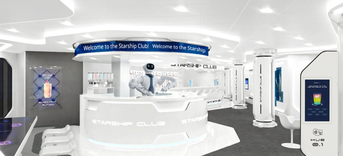 Sarà possibile anche visualizzare lo stato della preparazione del drink grazie ai monitor digitali all’interno dell’area e a una striscia a led posizionata sopra l’isola robotica, il mentre si è immersi in un’esperienza dallo stile spaziale.